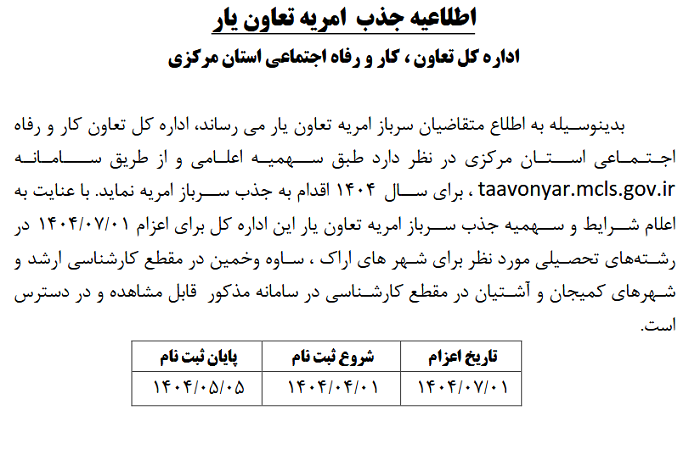 اطلاعیه جذب امریه تعاون یار ۱۱ تیر ۱۴۰۴ | ۱۲:۰۴ کد : ۵۲۷۴۸ اطلاعیه ارسال به دیگران نام شما ایمیل شما ایمیل دریافتکننده ارسال انصراف تعداد بازدید:۱۱۶۳ اطلاعیه جذب امریه تعاون یار